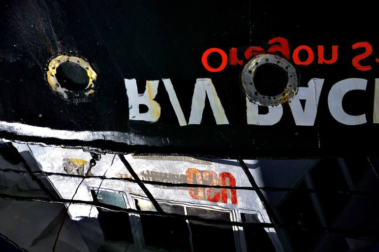 Limited Edition of 25 signed archival photographic prints with Certificate of Authenticity and signed label for back of photograph. Each photograph will have a 2mm Styrene backing for durability. 24" x 36" - $1100.00 plus shipping and handling - mailed in flat box. The side of a large ship reflecti...