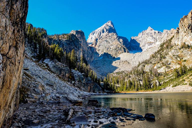 A hidden lake up in the wild of Grand Teton National Park, Wyoming. After a strenuous rigid climb of a rough mountain side you come over a rocky ascent to discover this beauty. As one of three lakes near the same trail, this alpine lake is rewarding in serenity and views.