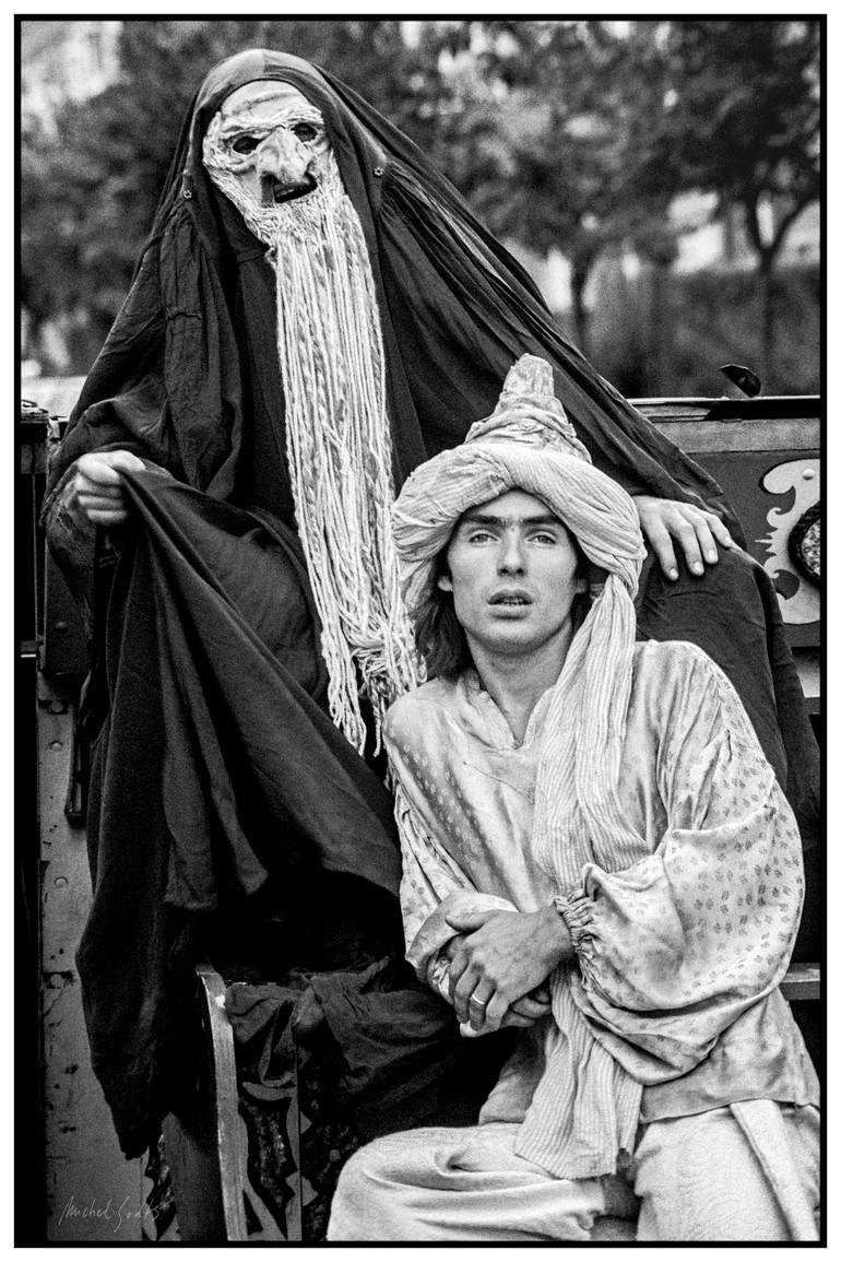 Costumed as characters from The Arabian Nights tales, two actors rest between performances at a medieval festival. (Captured on 35mm Tri-X film, Brussels, 1980. For sale July 2019.) • Black and white portraiture photography LIMITED SINGLE EDITIONS (1 of 1 each print dimensions) View my profile for...