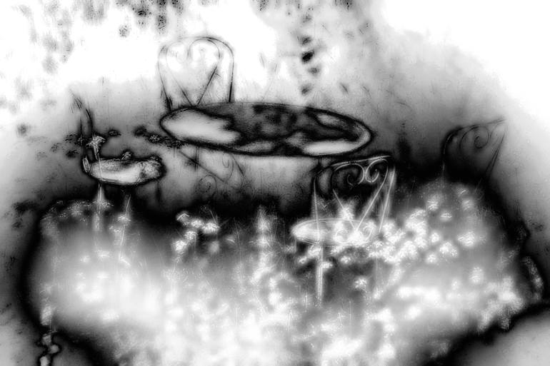 Enchanted garden in the South of France May 2019 ("Der verwunschene Garten Südfrankreich Mai 2019"). Blackwhite composition. In the small town of S. in the Provence there was an abandoned hotel with with an overgrown garden and a sofa set with table and 4 chairs. Long left ... Fine Art Paper Print...