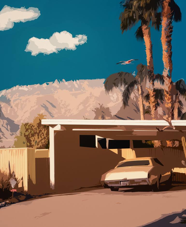 Graphic art in the style of a vintage travel poster, based on an original photograph of a Yellow Cadillac in Palm Springs car port.