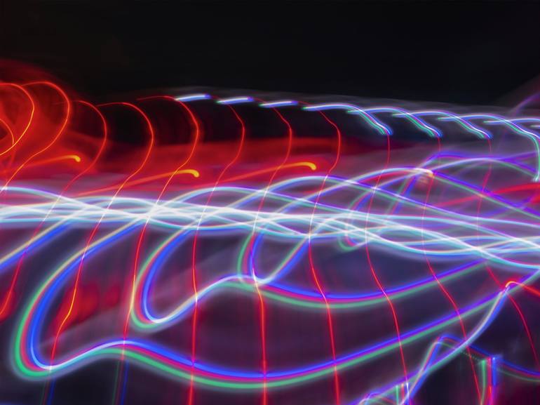 "Desire Lines 16" is an abstract expressionist photograph inspired by long exposure light trails. The colors and forms intersecting create a beautiful abstract design. This photo is part of series of photographs exploring the same theme.