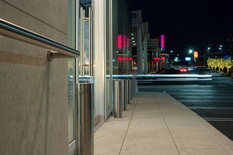 A New York diner hovers in distant night, as a modern glass and steel edifice reflects motion in foreground / left. A patron bears witness outside, as lights project their own shades and feelings. Featured in Saatchi collection, "Inspired by Quentin Tarantino." While my fascination with diners wel...