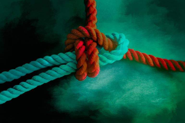Nautical double sheet bend knot on digitally painted watercolor background.