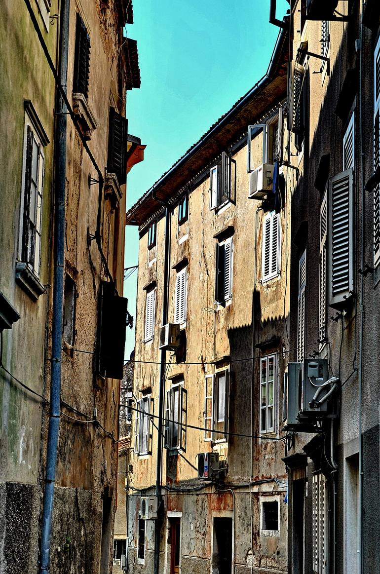 Photo was taken on the island of Cres in the beautiful coastal city. White stone houses on a beautiful Island of Cres ( Croatia ) . I walk through numerous small streets in the old city centre of Cres . Narrow and high small houses attaching to each other and streets winding in a maze through the o...