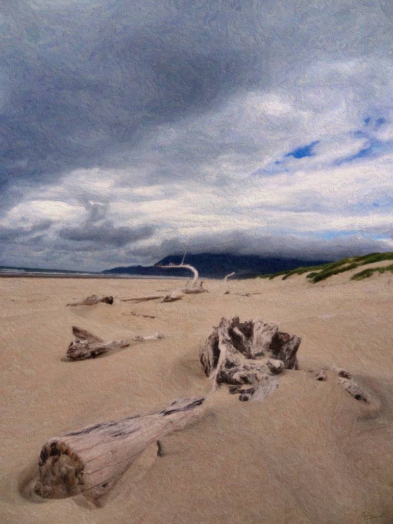 Driftwood in the sand at Nehalem Bay State Park in Oregon. Painterly effect mimics an impasto painting.