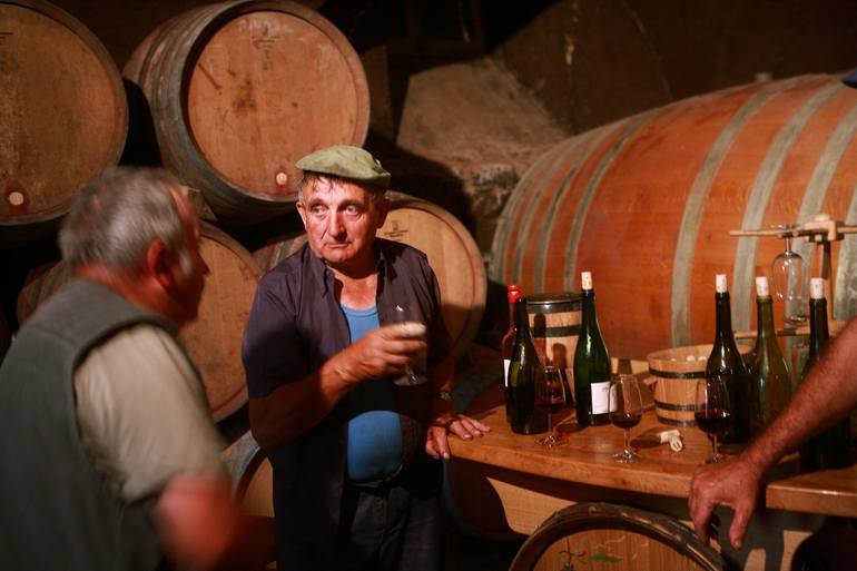 After the harvest, local workers have a drink in the cellars of Domaine de Vissoux, Beaujolais, France.