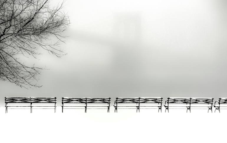 The winter in New York presents amazing images of iconic scenes and brings a new level of visual imagery to appreciate. This shot was taken during a blizzard in Brooklyn's Dumbo area near the water with the benches and trees clearly seen and the faint image of the Brooklyn Bridge peeking through the...