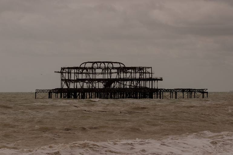 The skeletal remains of Brighton’s West Pier stand defiantly against a moody, cloud-filled sky. The brownish tones of the rusted structure blend with the restless sea, evoking a haunting yet beautiful scene. A testament to time and tides, where history meets the elements.