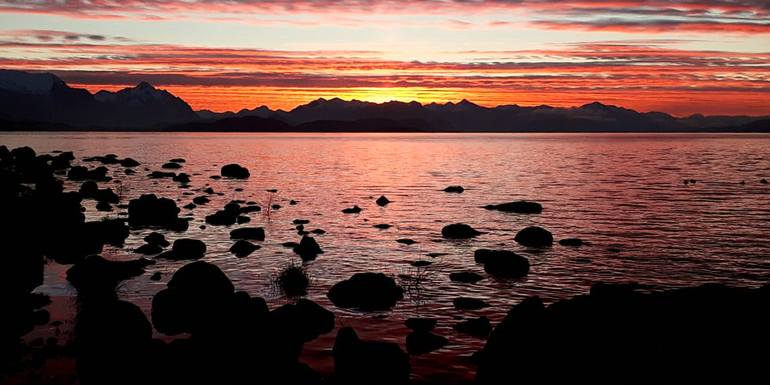 EN-This photograph was born from a magical moment in Bariloche, by the Nahuel Huapi Lake. As the sun bid farewell, the sky turned red, orange, and violet, its fiery colors reflected on the calm water. The mountains, dark and majestic in the background, appeared as silent guardians of this fleeting s...