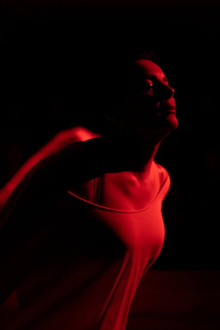 This evocative photograph captures the essence of a theatrical performance centered on the complexities of womanhood. The subject is bathed in a deep red hue that speaks to the passion and intensity of the narrative. The stark contrast and the play of shadow and light draw attention to her contempla...