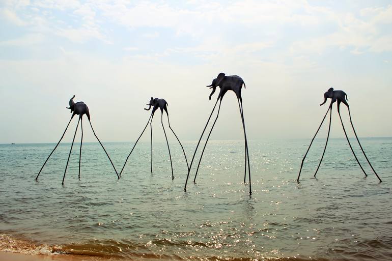 This whimsical photograph captures a surreal scene of elephants wading in the shallow waters of a beach. The elephants, depicted with elongated legs, appear to be walking on stilts, creating a playful and dreamlike atmosphere. The contrasting elements of the majestic elephants and the serene beach s...