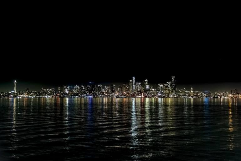 The Seattle skyline at night reflecting city lights on Elliott Bay viewed from West Seattle.
