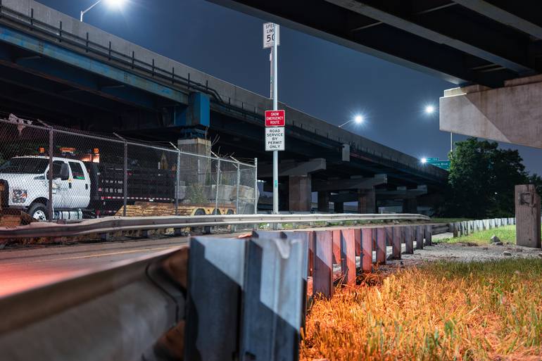 "Emerg(ency Route)" + "Perm(it Only)": Signs of the Times. Pale lightcasts shadow the ground, as concrete dreams pass overhead. Edition of 7 + 1 A/P and 1 P/P. Printed exclusively for the artist by Brooklyn Editions' Master Printmaker, New York City. Hahnemühle Photo Rag Bright White 310 gsm, with...