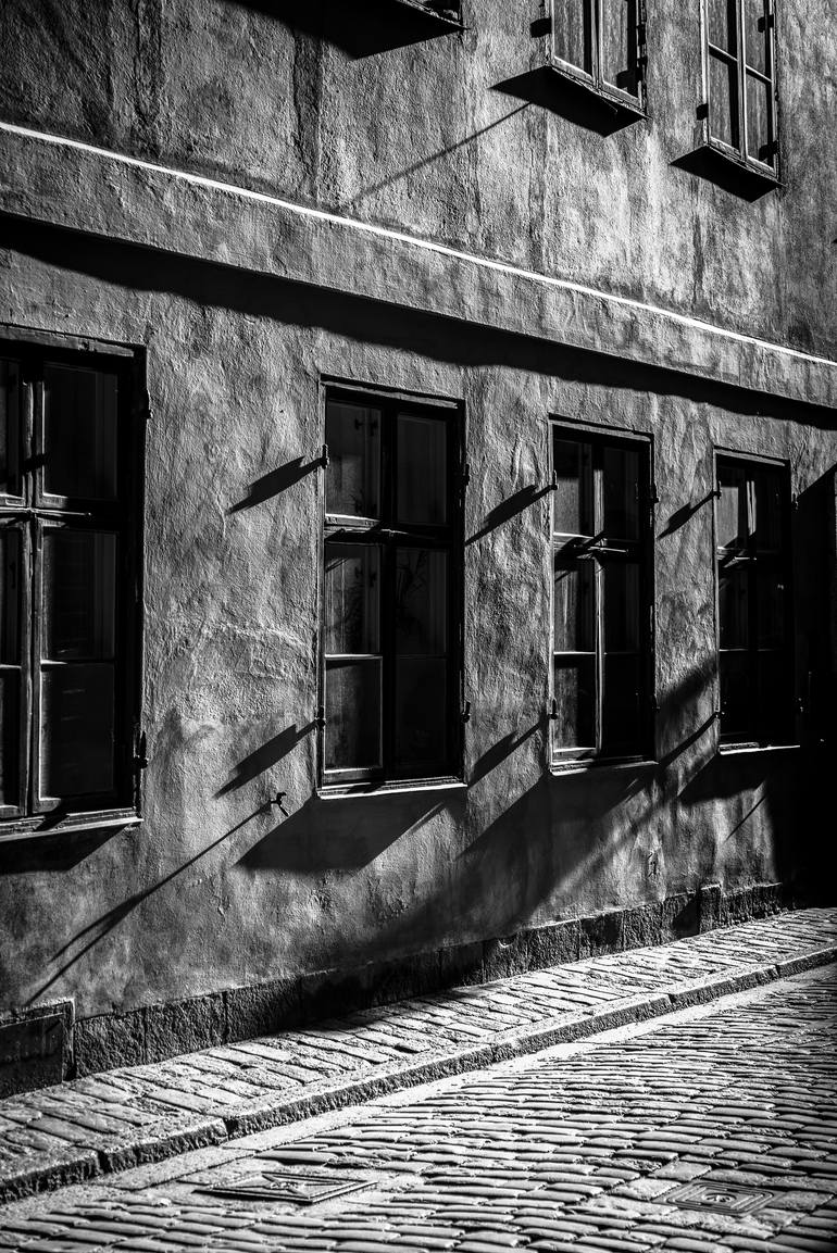 Empty street in early morning with light casting shadows and accentuating texture.