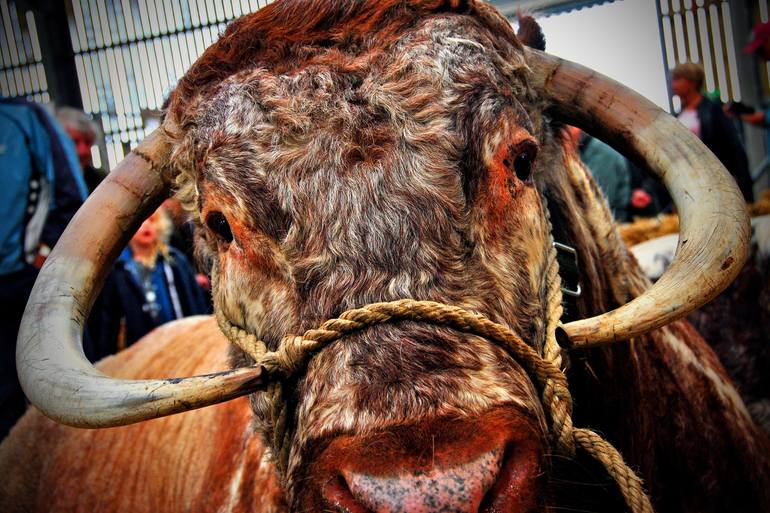 English long horn cow cattle at Newbury Show Berkshire England United Kingdom photography by Andy Evans Photos. Limited edition prints are processed using Hahnemuhle Baryta fine art paper. A bright white based, acid-free and lignin-free paper benefiting from a high-gloss premium inkjet coating combi...