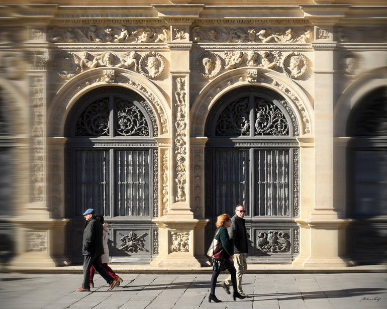 I took this photograph in Seville, Spain, in front of the city's imposing City Hall building. What motivated me to take this photograph was the desire to make a record of the beautiful architecture of this building and also the intense movement of people who pass in front of it on a daily basis. Usi...