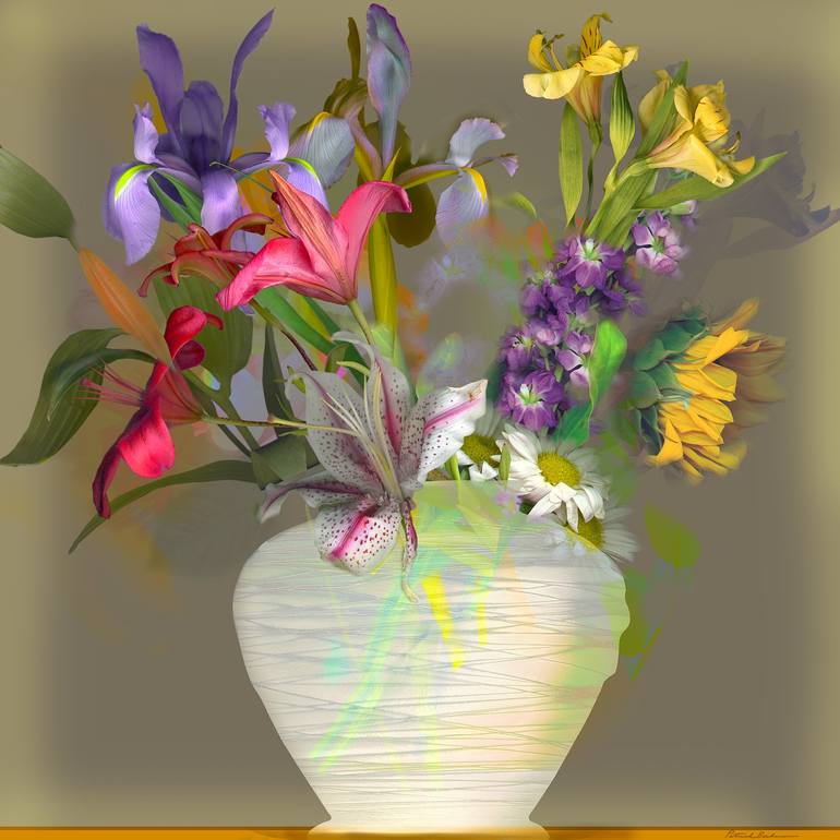 "Excellent Sunday Flowers" is a vibrant floral study created using a desktop scanner to capture individual flowers and a decorative vase. The artist arranges these scanned elements digitally, creating a composition that feels both contemporary and timeless. The relatively shallow space in this digit...