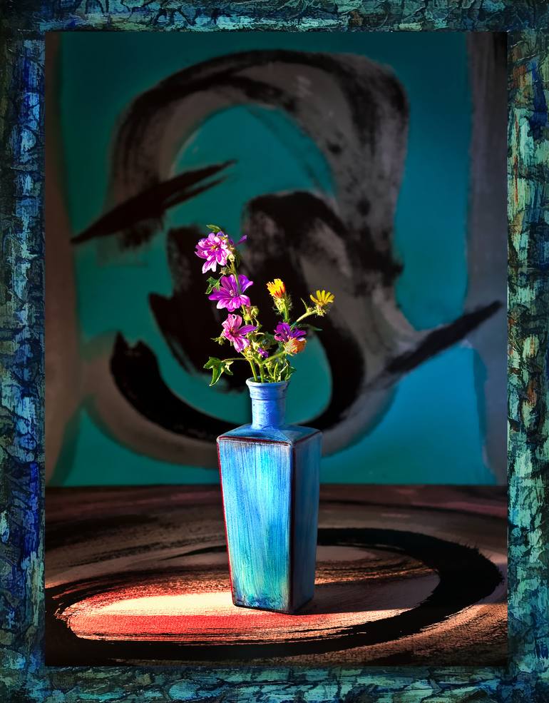 This floral still life is part of a series that I used my watercolor brush paintings in the background and surface. The idea was to create a connection between the two. I also painted the small flower vase and picked the flowers from my yard.