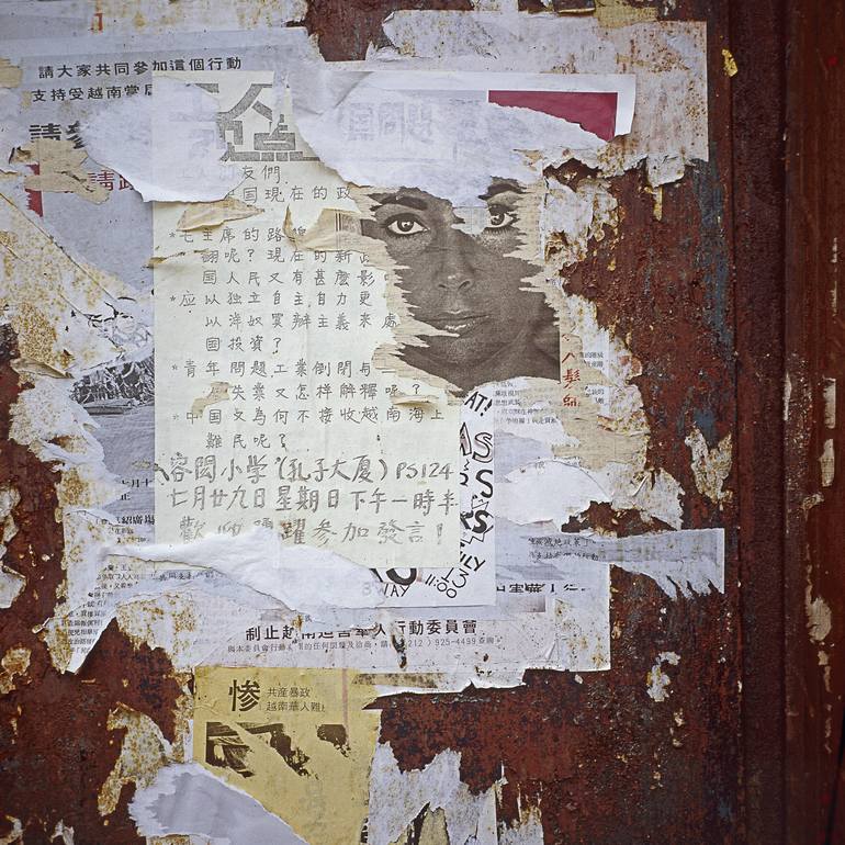 Part of my Art i Facts series. A collage of posters found on a wall in Chinatown, NYC, in 1979. At that time, I was searching for subjects within the frame which seemed to be in dialogue. I will let the viewer decide what that dialogue is or means. The image was made with a medium format TLR camer...
