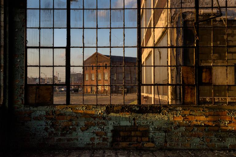 Photograph of abandoned factory interior, looking through dirty windows at brick building. Original prints are printed on giclee watercolor paper with archival ink
