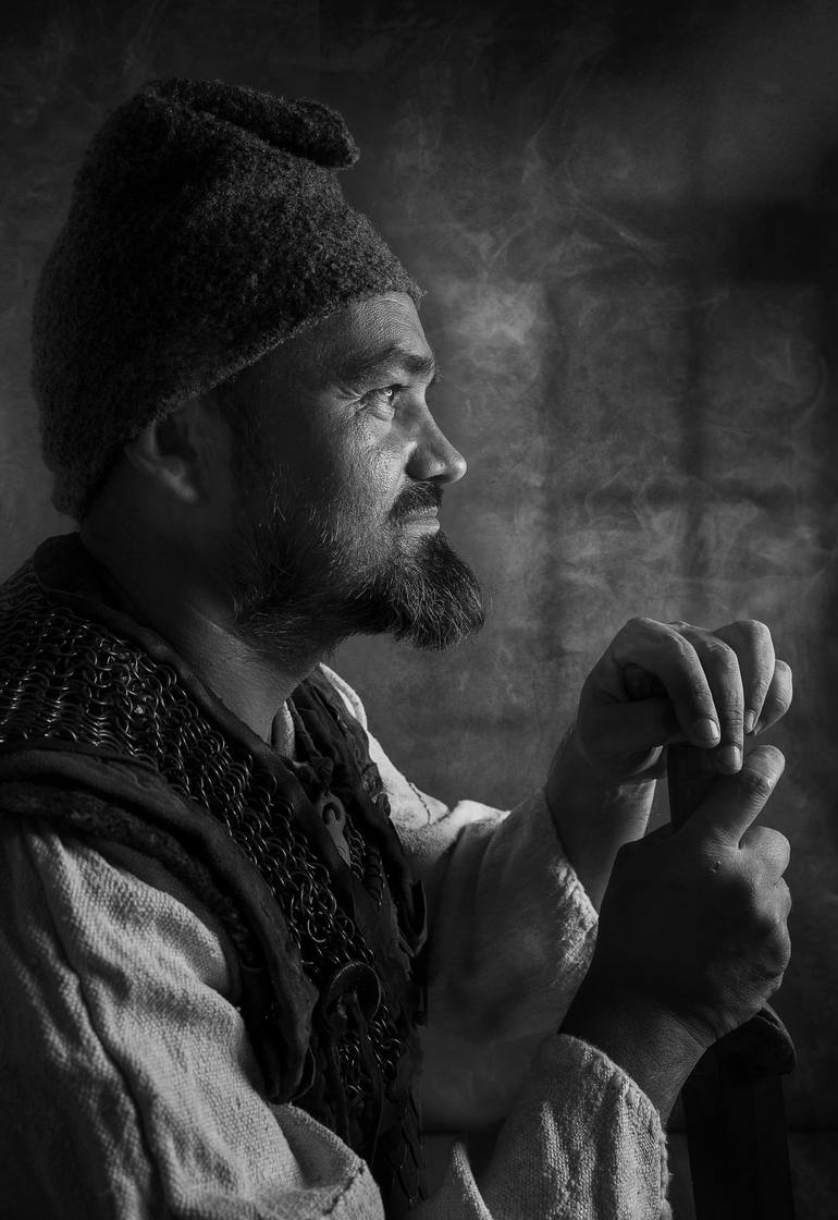 This striking black and white photograph, "Fighter," is a conceptual reconstruction of a Dacian fighter's equipment. The artist masterfully employs photorealism to create a thought-provoking portrait of a man embodying the spirit of an ancient soldier. The artwork evokes a sense of history, cultur...