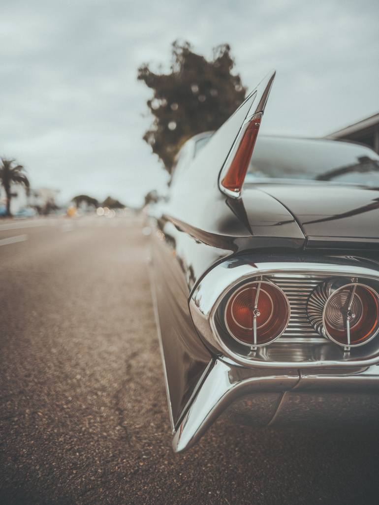 An image of a black 1961 Cadillac Coupe DeVille, emphasizing the dual fin design.