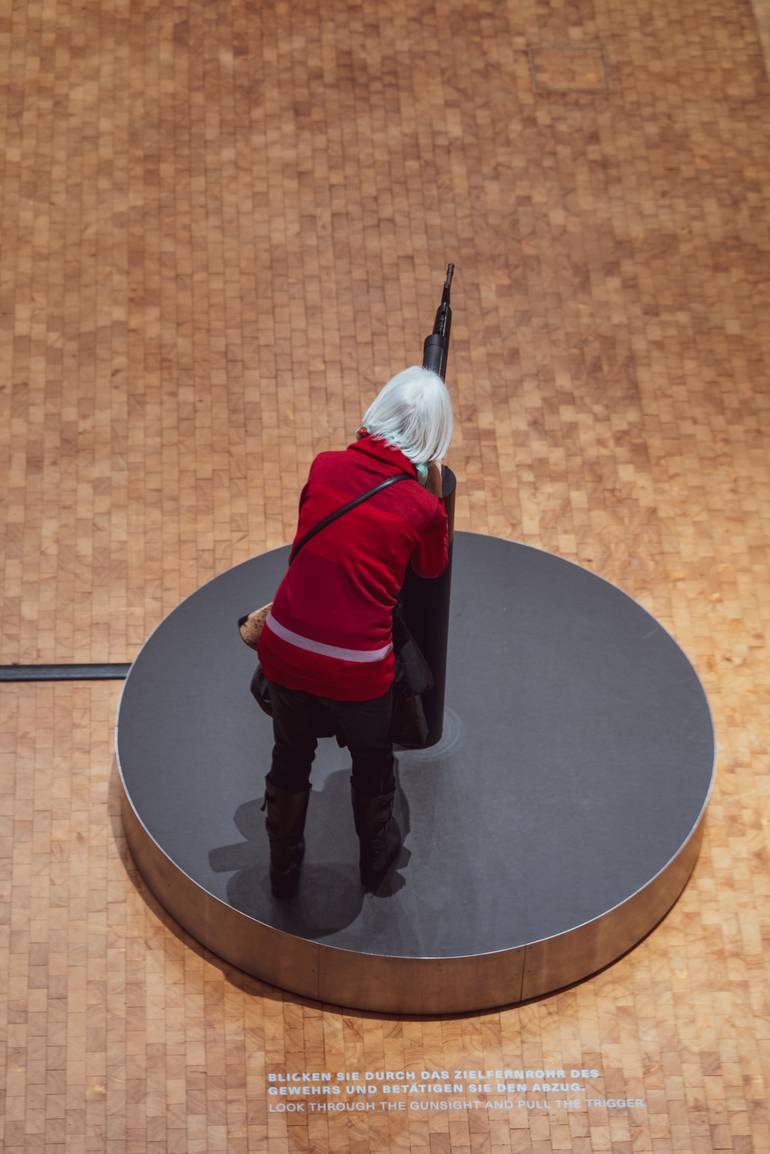 ZKM Karlsruhe 2020, Germany. Museum on the open day in January 2020. Old lady with a (dummy) gun firing?! Feuer frei ! Fire ! - Christmas 2019 is over! Fine Art High Quality Digital Print. Signed by artist on the back. Limited edition.