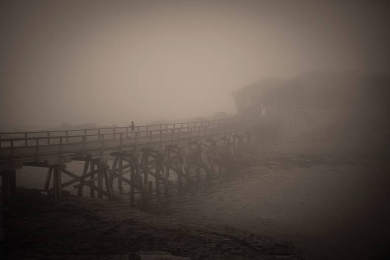 A solitary figure casts a line from a fog-shrouded pier, barely visible through the coastal haze. This quiet, atmospheric scene captures the haunting beauty of early morning solitude—where land, sea, and sky dissolve into a soft, dreamlike veil.