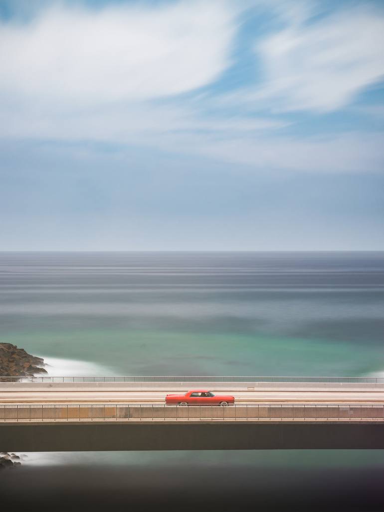 A red 1960s Cadillac crossing a lagoon bridge on Pacific Coast Highway 101 in San Diego, CA. This is a composite of a fast exposure and long exposure photograph, taken in immediate succession.