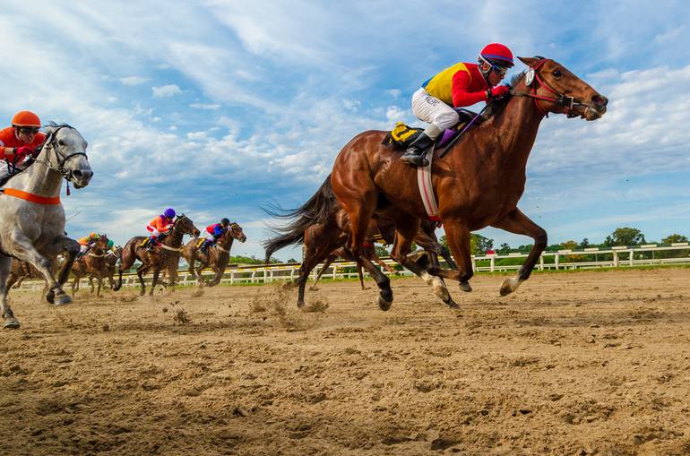 A thrilling moment captured on the racetrack as powerful racehorses surge forward, their jockeys urging them with precision and determination. The energy, speed, and intensity of the competition are frozen in time, showcasing the raw spirit of horse racing against a vivid sky. This photograph was in...