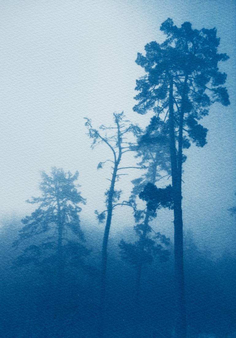 Clients include: Timothée Chalamet, Starbucks, Ritz Carlton, Mayo Clinic, Jumaira Resort (Dubai), Wyndham Worldmark Hotels, Kimpton Hotel Monaco, Evercore NY, Apollo Global Management, NY, Mazars Accounting NY, Limelight Mammoth Hotel & Residences, MD Anderson Hospital, Houston Methodist Hospital, Oakland International Airport. Christine So is a painter, photographer and printmaker living across the San Francisco Bay in the hills of Oakland, California. Her works are heavily inspired by the woods where she has lived and hiked for decades. She works in acrylic and in the antique photographic process of cyanotypes. She creates botanical and abstract prints without a camera lens, as well as hand-printed landscape photographs of the foggy woods where she lives. Whether it’s painting, printmaking, or photography, her work is always nature-inspired and nearly always monochromatic. She has worked in a dozen mediums, cycling back and forth from painting to printmaking to cyanotype, applying effects from one medium to the next. She bridges the mediums of photography, monoprinting and painting. Her favorite question when working in the antique photographic process of cyanotypes is “What would happen if…?” She has devised a range of atypical techniques using the cyanotype process. Arguably the most striking of her unique methods are her cyanotype paintings in her Delft Garden series. The painted silhouettes of plants each contain an intricate blue and white pattern within them when viewed up close.The lengthy process begins as a pencil drawing which is then painted in–not with ink or paint–but with the cyanotype light-sensitive mixture in a dark room. It’s a tricky process as it’s hard to see what one is painting in very dim light. Days later once the photography chemicals have dried in the painting, she lays plants on top of the painted silhouette in a pattern that will leave gaps similar to lace. She then carefully moves the entire bundle outside and exposes the pattern to sunlight to create the image-within-the-image. The blue and white pattern seen in each leaf resembles painted Delft pottery, thus the title of this series: Delft Garden. Another of the artist’s innovative techniques is her series of completely abstract cyanotypes printed without photo negatives or stencils.