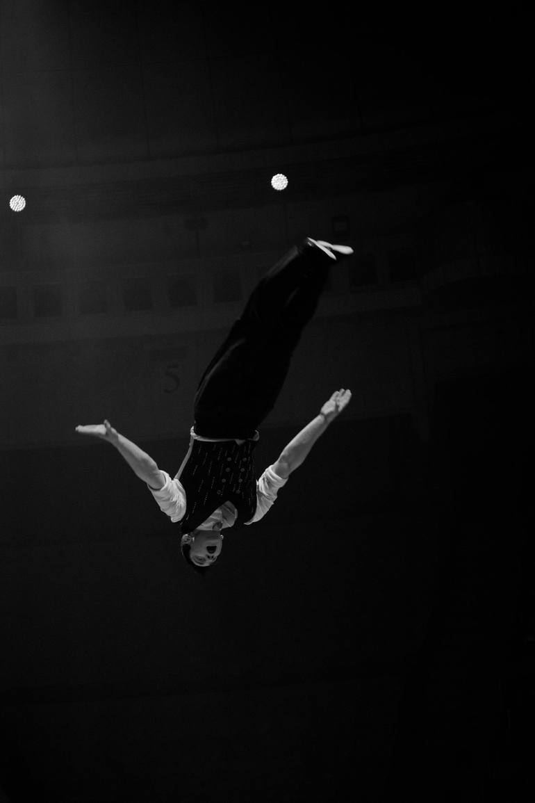 I caught this beautiful moment at a circus performance. The composition, light, the position of the performer's body and his emotions perfectly complement the subject of the shot and create an effect of drama and deep meaning. This black and white photograph captures the exhilarating essence of perf...