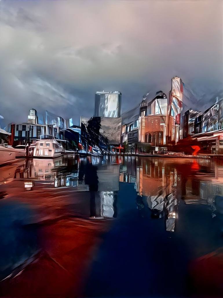 The 'Docklands at Dusk' series is based on photographs taken of Docklands in Melbourne and the Harbour waterfront as seen from a boat around dusk. The weather conditions made for a dark stormy sky which provided a theatrical backdrop for the vivid colors of the sunset projecting it light cinematical...