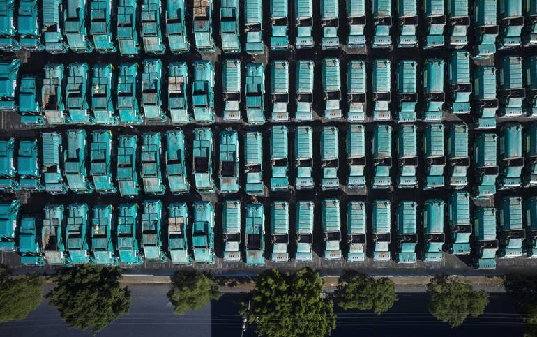 Aerial shot of the garbage truck yard in Los Angels Downtown.