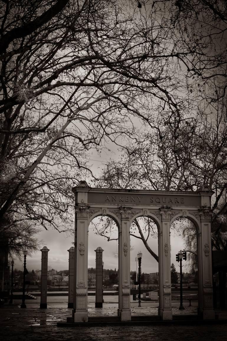 Gateway to the City, Portland Oregon... the arch at Ankeny Plaza, is the center of Old Town Portland, a National Historic District. Established in the late 1800s, the centerpiece of the plaza is this arch. Brick and cast iron buildings are predominant in this lively area of the city. The picture ...