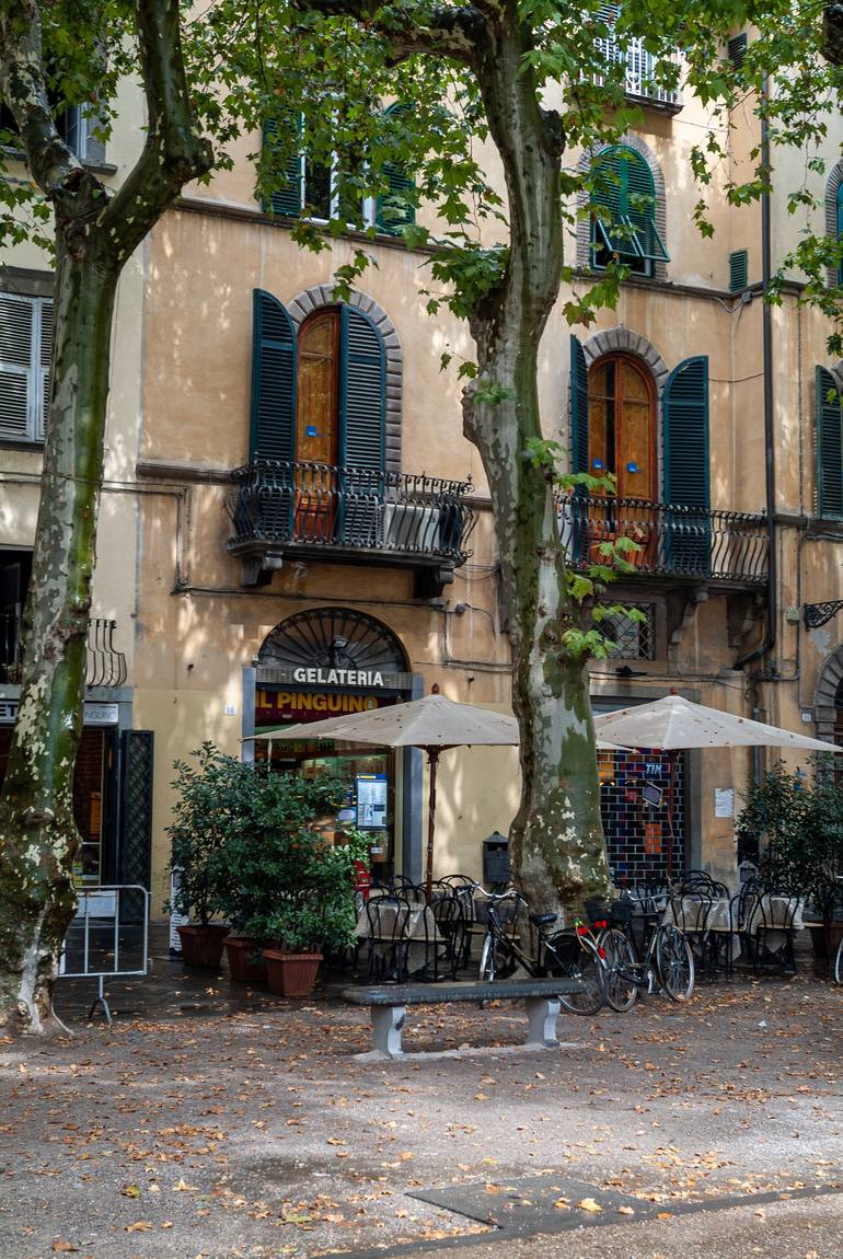 Photographed in Lucca, Italy in 2004. Gelateria on a tree lined street with bicycles leaning against tables and fall leaves littering the street. Available as Signed & Numbered Limited Edition of 10 and also as an Open Edition Print (Not Signed/Numbered) Limited Edition are Custom printed on arch...