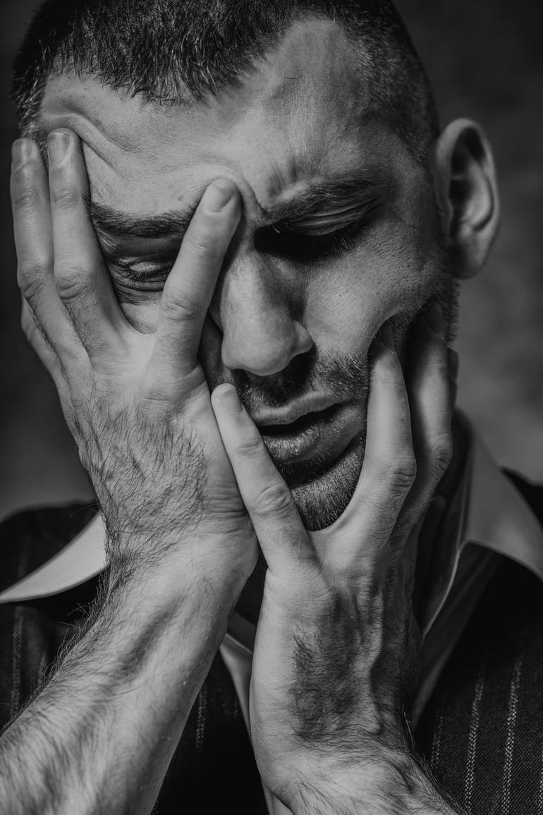 Captured in stark black and white, this eerie portrait plunges viewers into the depths of human emotion. The man is depicted with his hands clasped tightly to his face, his fingers digging into his skin as if trying to cope with inner turmoil. His facial expression, etched with pain and vulnerabilit...