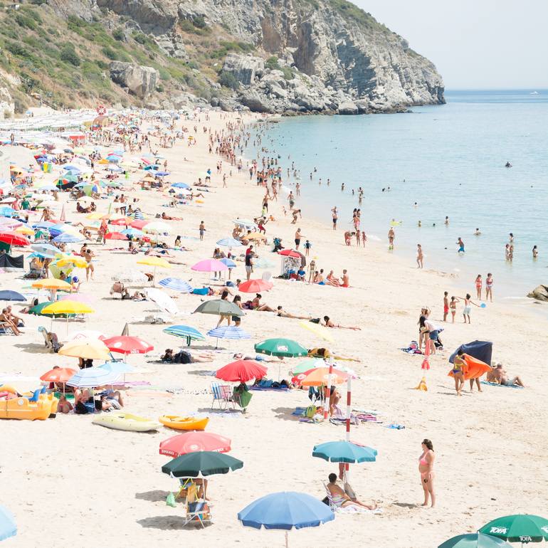 People sunbathe under the bright summer sunshine, enjoying a relaxing day at the beach. The photograph's colours range from white to pastel tones, creating a soft and peaceful atmosphere. From a Limited Edition of 15 - Signed Certificate of Authenticity with Edition Number. - Printed on Hahnemühle ...