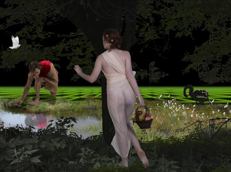 Beautiful Narcissus, who loved only himself, gazing at his reflection in the waters of the lake with admiration. Nymph Echo is hiding behind the tree, gazing at him with admiration. As an artist influenced by each event taking a place in her life and around her on a global and human scale, I have cr...