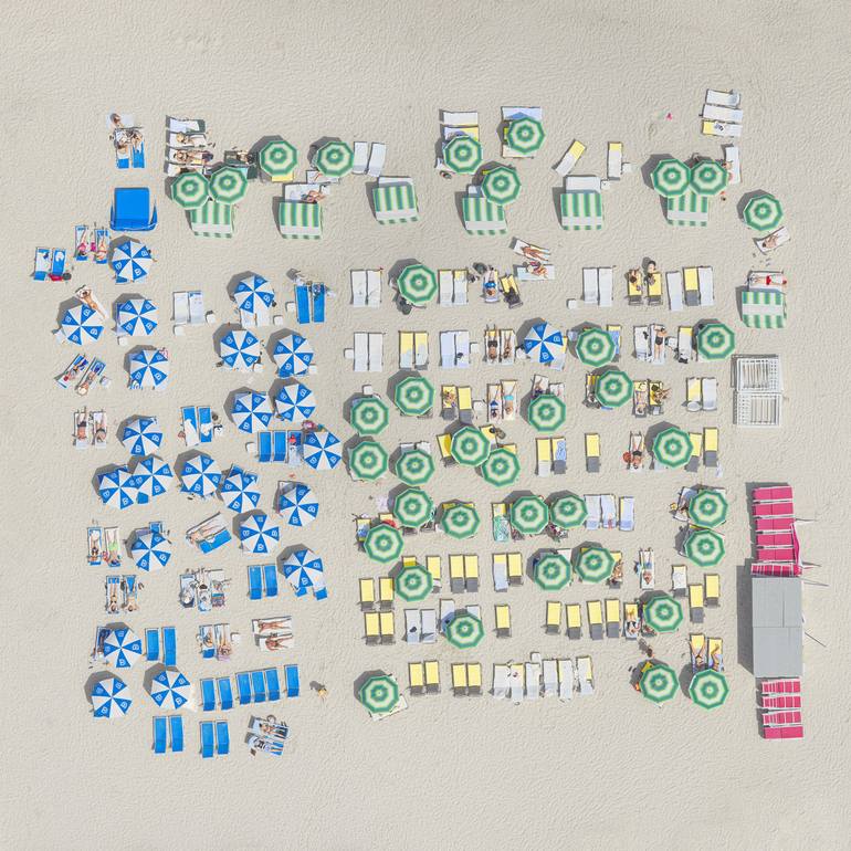 Captured from a unique aerial perspective high above Miami Beach, "Green and Blue Umbrellas" offers a fresh look at a familiar scene. Transforming the bustling shoreline into a study of color and form. The rhythmic arrangement of green and blue umbrellas creates a soothing visual experience, invitin...