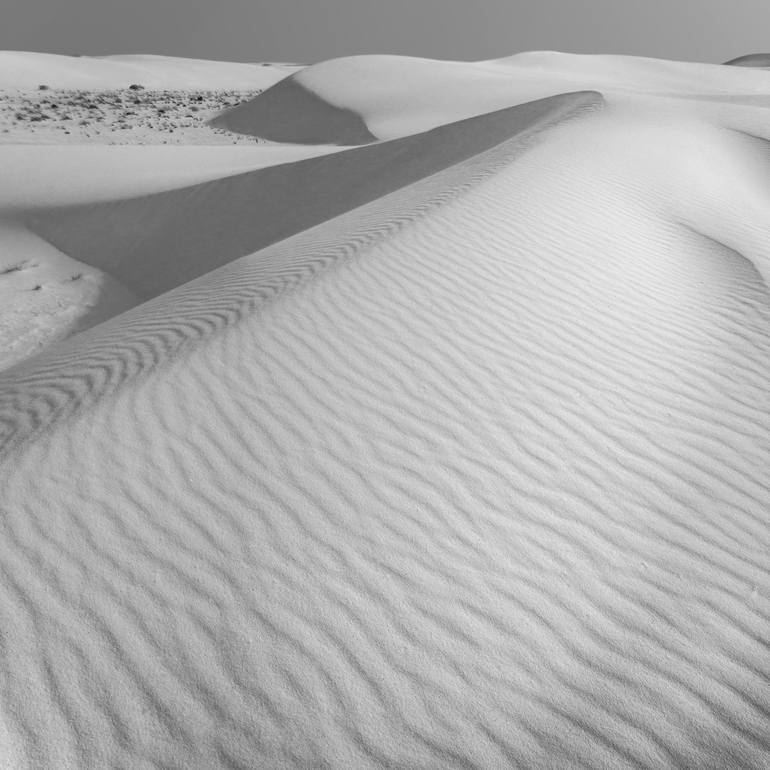 My elegant square black and white desert scene captured amongst the shifting gypsum dunes of New Mexico, planet Earth! Part of my splendid Gypsum Dune series. Original, unique signed art by Murray Bolesta! This is a signed, limited edition art print sized 30 inches wide by 30 inches tall, borderles...