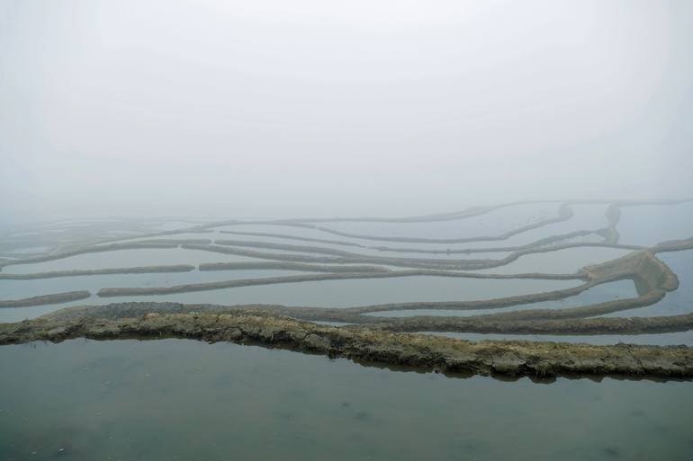 These rice paddies seem to float in fog, look like 'Hanging gardens' though these flooded fields don't show any rice sprouts in spring yet. The photograph was taken at a World Heritage Site in China, during a longer, fascinating hike through the fog. The site is well known for its amazing rice-padd...