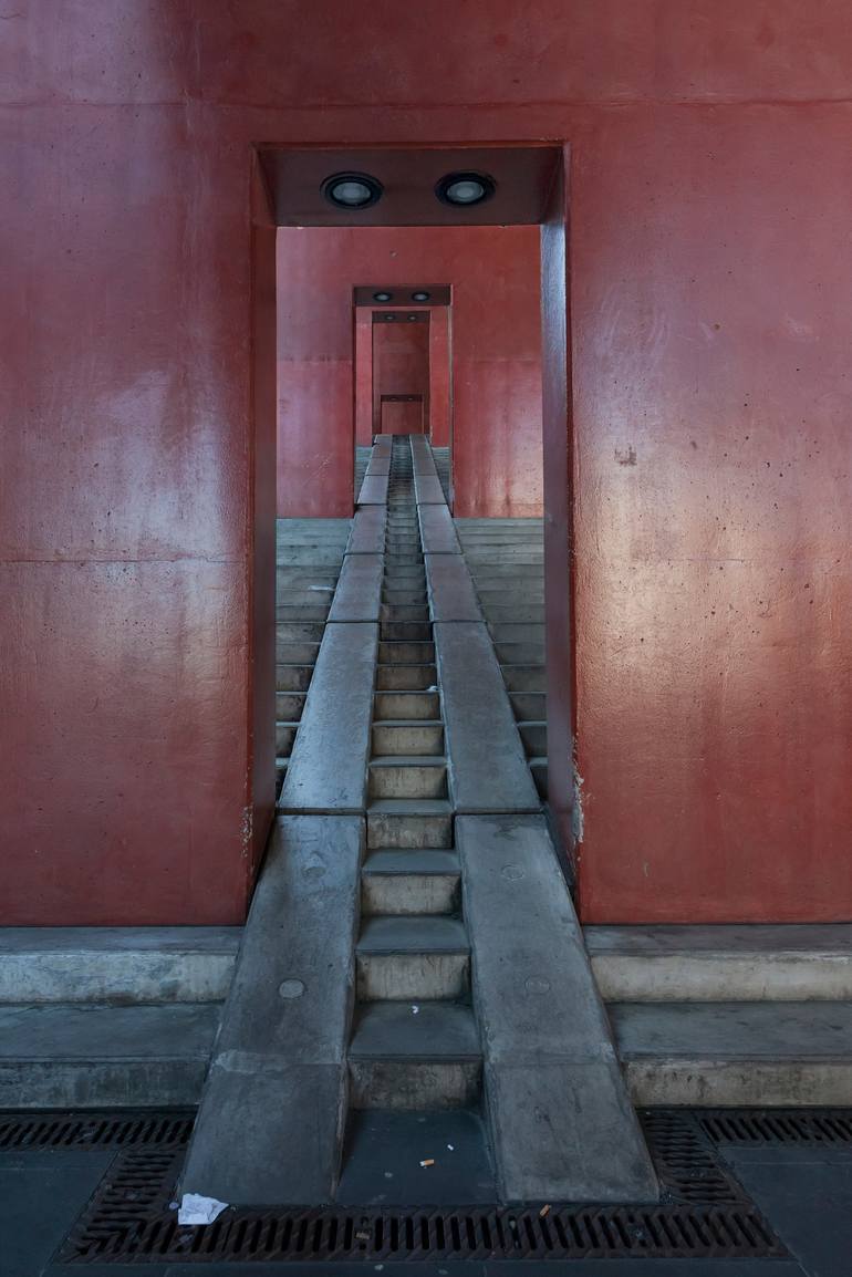 Cologne district city hall, passage to entrance, ramp for wheelchair Perfect light and view to emphasize social handicap.
