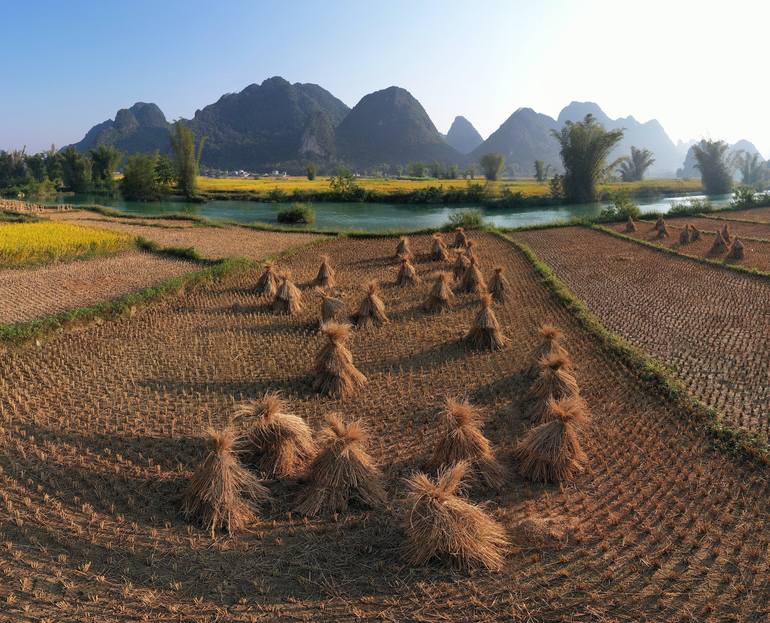 Countryside painting: The delicate camera angle captures the harmonious scene between the vast fields, the gentle winding stream and the majestic mountains looming on the horizon. The natural light is masterfully controlled, creating a harmonious contrast, honoring the peaceful and majestic beauty ...