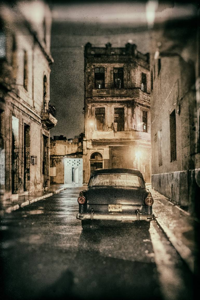 A wet night in Havana an American styled classic automobile from the 1940's era parked in a quiet street close to The Malecon, evoking a time long past a glimpse into a bygone era. Using a wet plate technique to emulate the old large style pioneering cameras of a bygone era and giving a timeless qu...