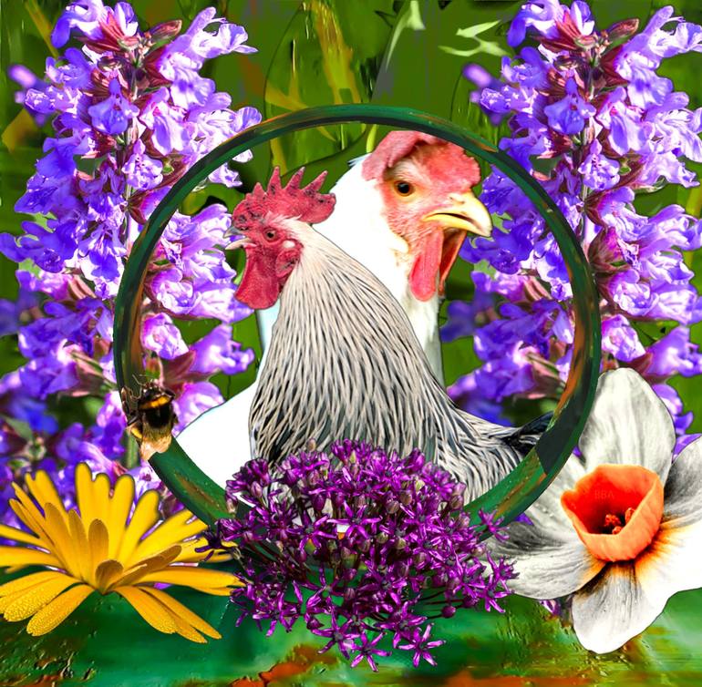 A Hen and a Rooster in a beautiful garden, colourful and beautiful a great piece of Art for the wall in your home. For more information about my art check out my blog: .html