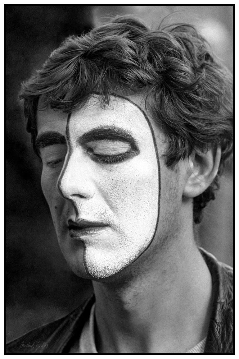 I photographed this young man as he was waiting for a final touch to be applied to his face paint mask—a profile representing the man on the moon. (Captured on 35mm Tri-X film, Brussels, 1980. For sale July 2019.) • Black and white portraiture photography LIMITED SINGLE EDITIONS (1 of 1 each print...