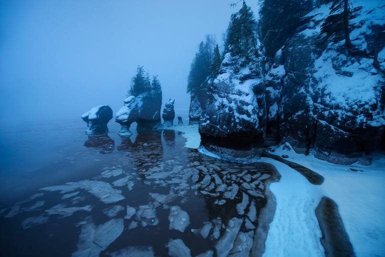 Ice breaking up as the tides rise at Hopewell Rocks under a thick blanket of fog at sunrise. All large prints are an edition of 3, and are available in 20x30, 32x48, 40x60 & 48x72 (or similar size depending on the format of capture). All images medium format film camera or D800, and prints provided...