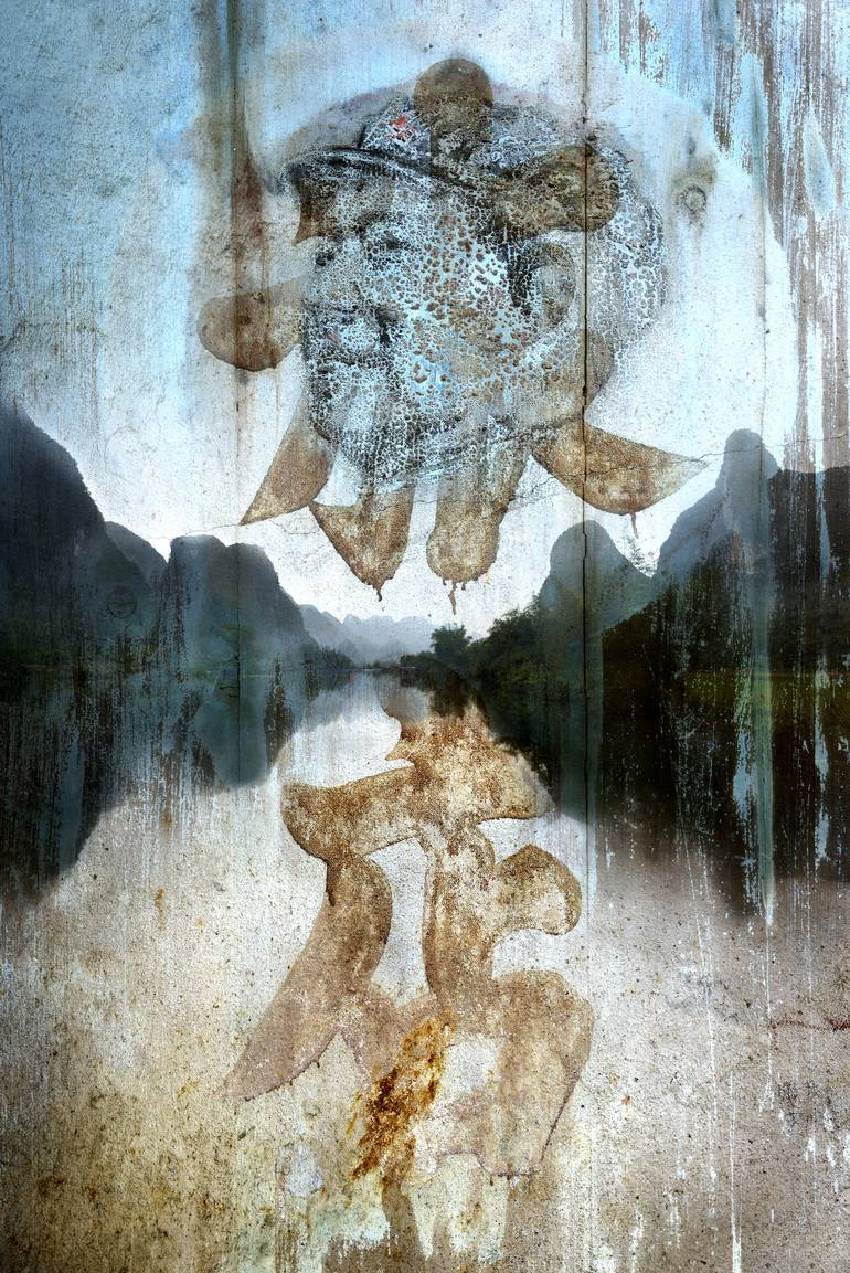 In the old Chinese village of Daxu near the popular town of Guilin, I came across a faded painting from the Mao era of Mao himself and some old faded painted calligraphy that I found out was a name of a hotel. I then overlaid these images over an image I took of the Li river that winds its way throu...